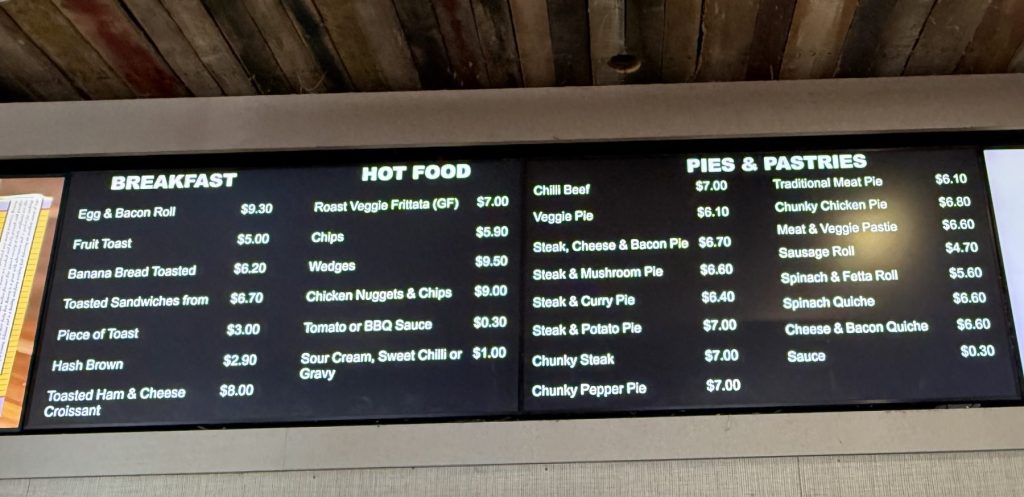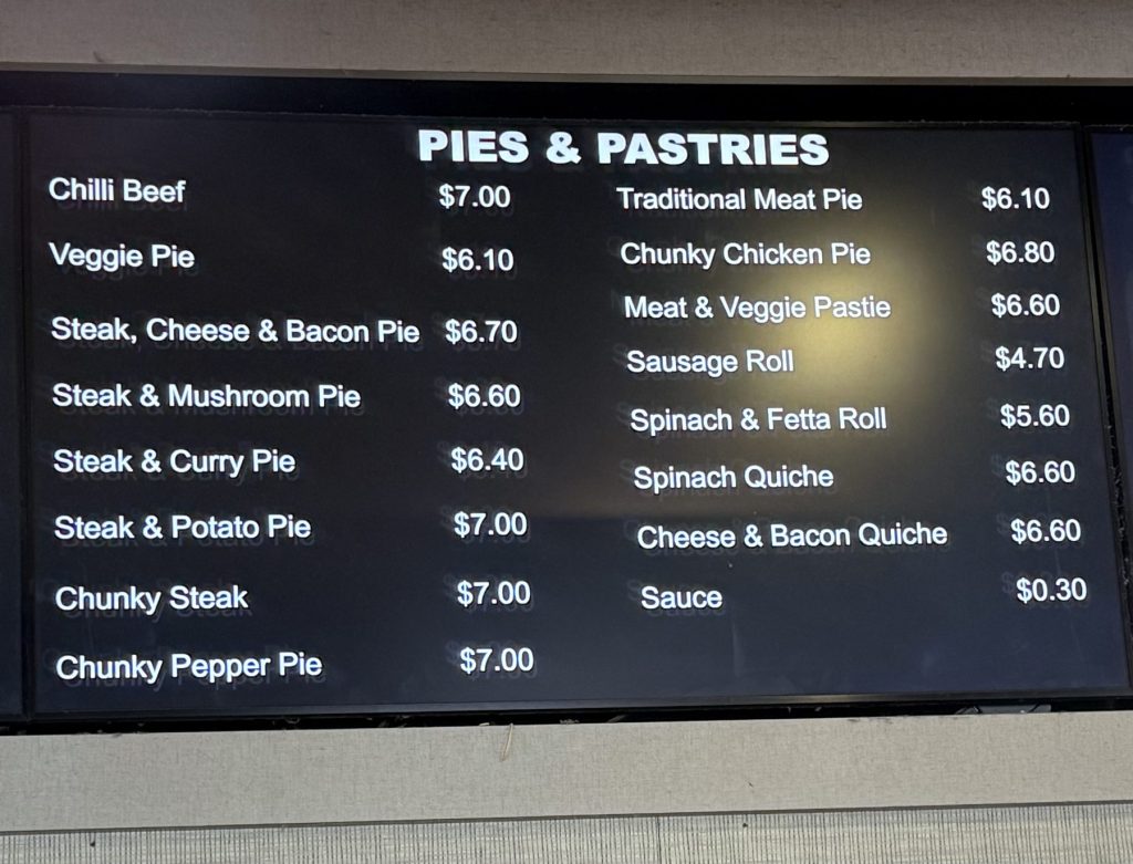 Despite the volume the wait times are short and the products available will cater for everyone. Fresh products are consistently being added to the cabinets and the huge pie warmer. Speaking of 🥧’s, Jeannette was under the pump making coffee’s and I needed to go watch some football, so we got cracking.